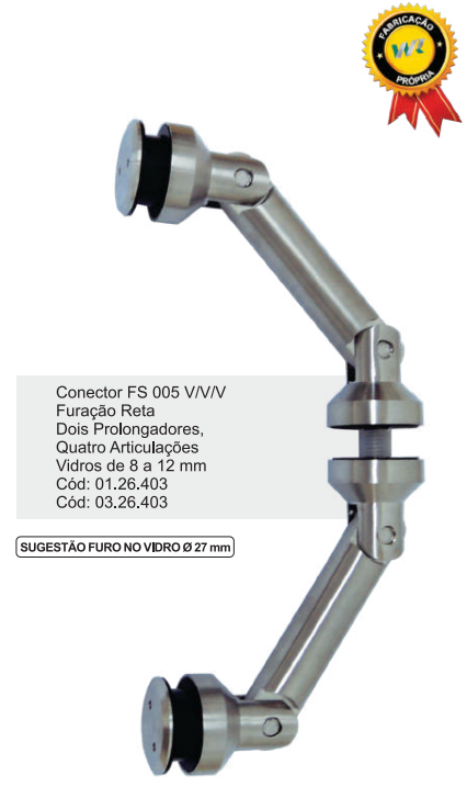 Conector FS 005 V/V/V Furação Reta Dois Prolongadores, Quatro Articulações Vidros de 8 a 12 mm Cod.: 03.26.403 Detalhes